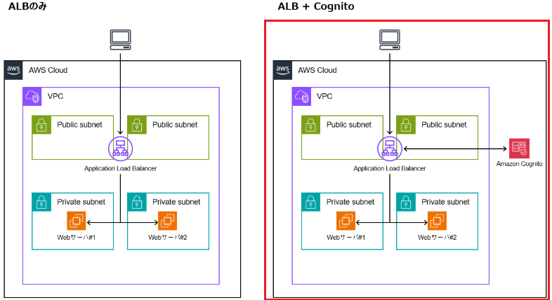 構成としては以下のように、既存のALBによる通信にCognito認証を追加するイメージです。