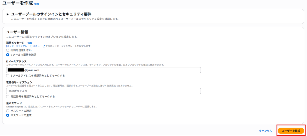 ユーザー情報を設定し「ユーザーを作成」をクリック