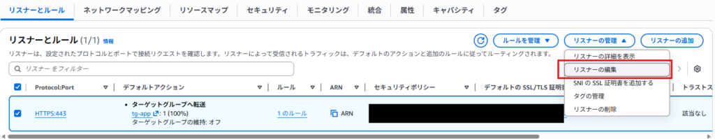 ALBを選択し、「リスナーとルール」⇒「リスナーの編集」をクリック