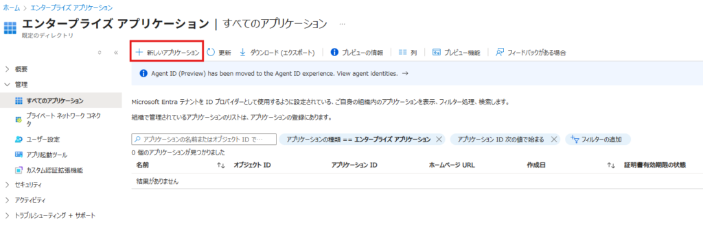 Azureポータルの「エンタープライズアプリケーション」⇒「新しいアプリケーション」を選択