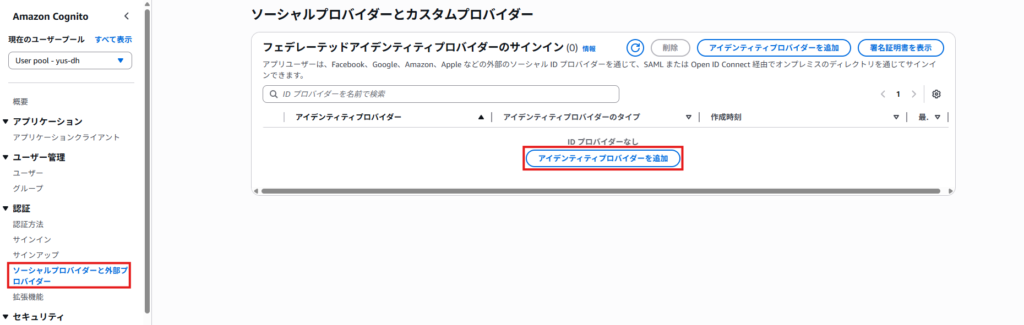 IDプロバイダー:先ほど作成したアイデンティティプロバイダーを選択