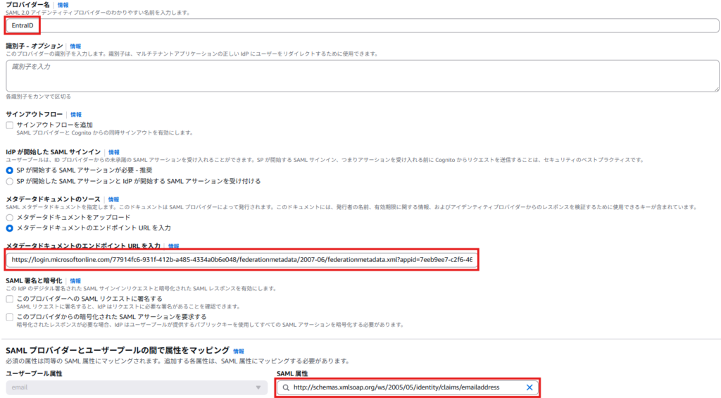 メタデータドキュメントのエンドポイントURL:先ほどメモしておいたURLを入力