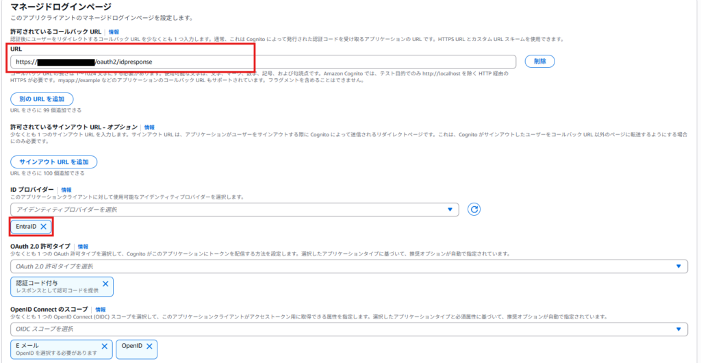 許可されているコールバックURL:https://(ALBのDNS名)/oauth2/idpresponse