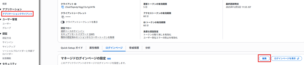 「アプリケーションクライアント」⇒「ログインページ」⇒「編集」を選択