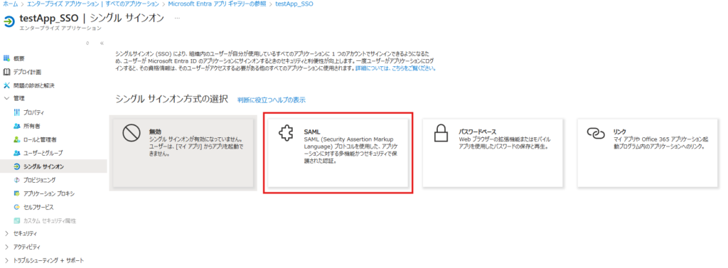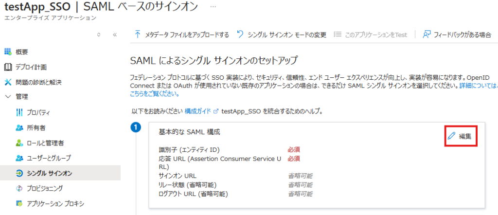先ほど作成したEntraIDでのアプリ画面にて「基本的なSAML構成」の「編集」を選択