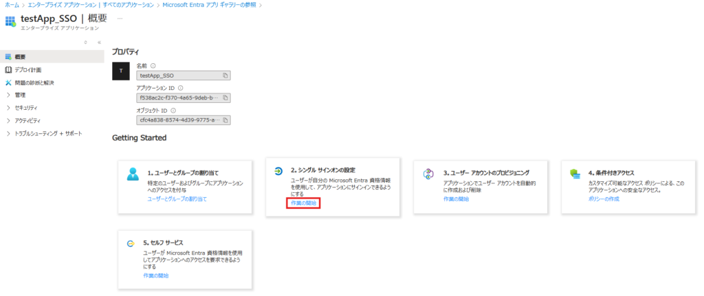 画面が遷移したら、「2.シングルサインオンの設定」の「作業の開始」を選択