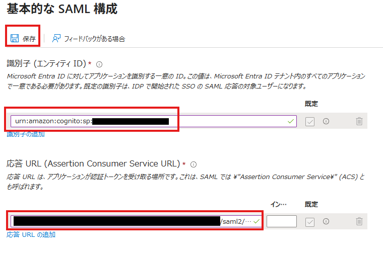 応答URL:Cognitoドメイン/saml2/idpresponse