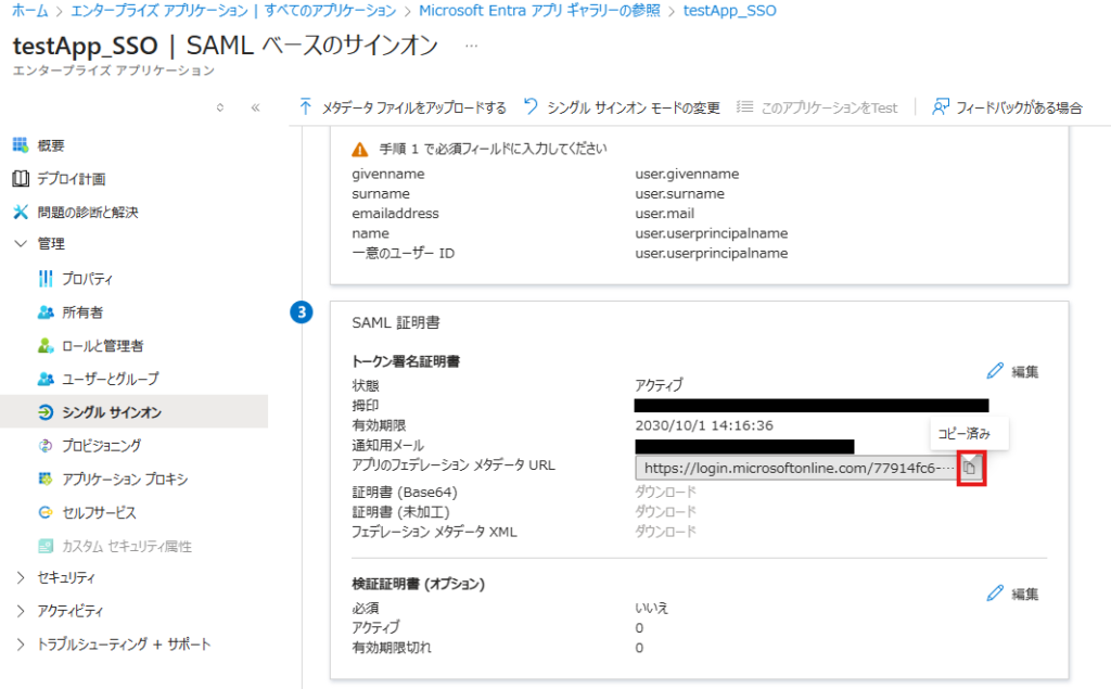 「③SAML証明書」⇒「アプリのフェデレーションメタデータURL」をメモする