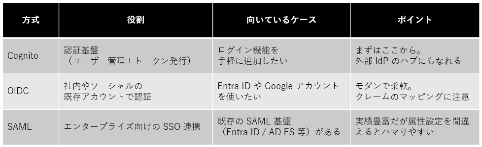 AWS でアプリケーションを運用する場合、Amazon Cognito をはじめ、OIDC や SAML といった複数の認証方式が選択肢として登場します。